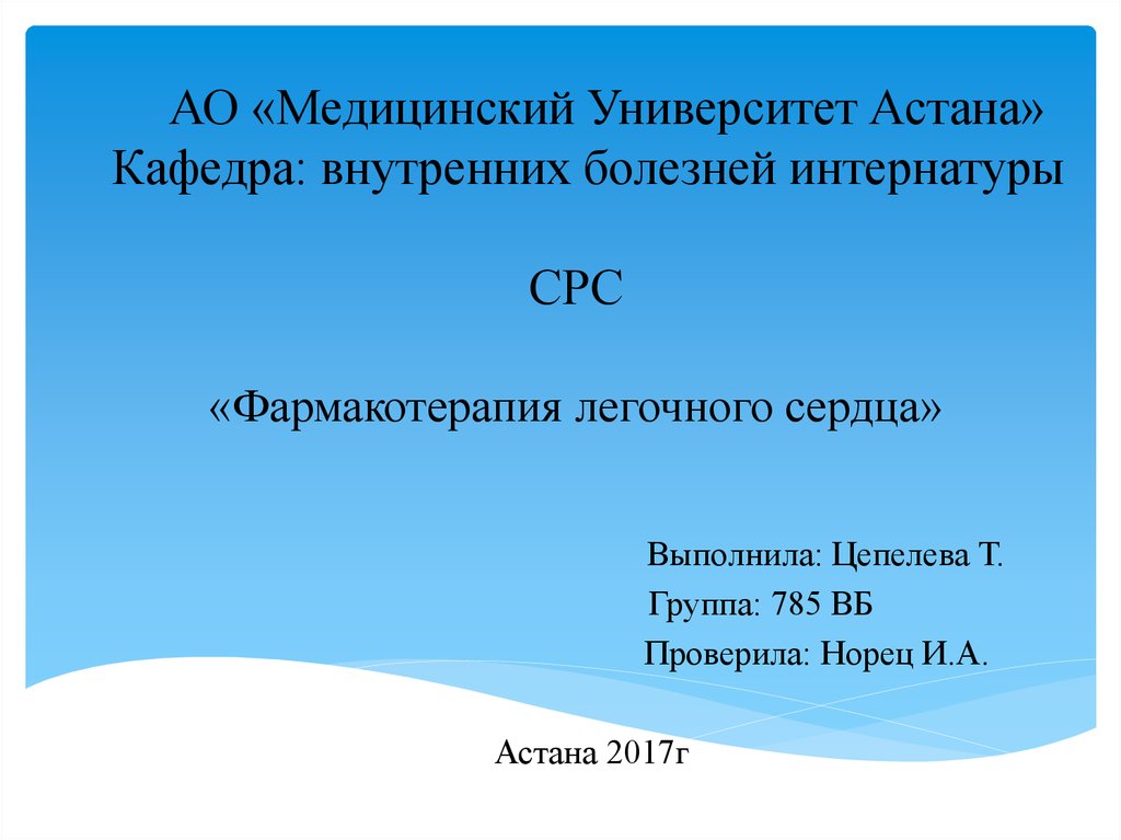 1. АО «Медицинский Университет Астана» Кафедра: внутренних болезней интернатуры СРС «Фармакотерапия легочного сердца»