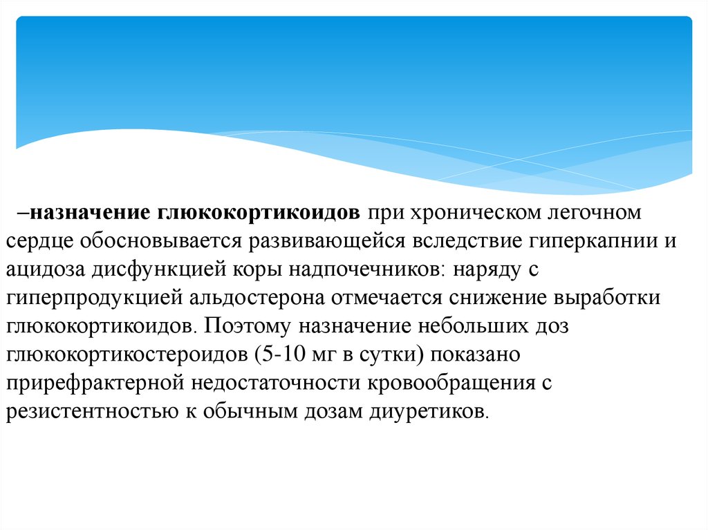 –назначение глюкокортикоидов при хроническом легочномсердце обосновывается развивающейся вследствие гиперкапнии и