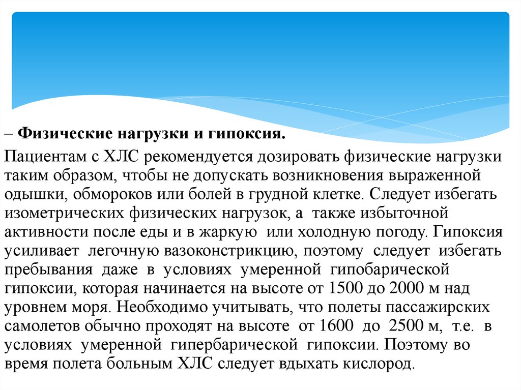 – Физические нагрузки и гипоксия.Пациентам с ХЛС рекомендуется дозировать физические нагрузки