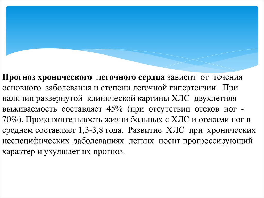 Прогноз хронического легочного сердца зависит от теченияосновного заболевания и степени легочной гипертензии. При