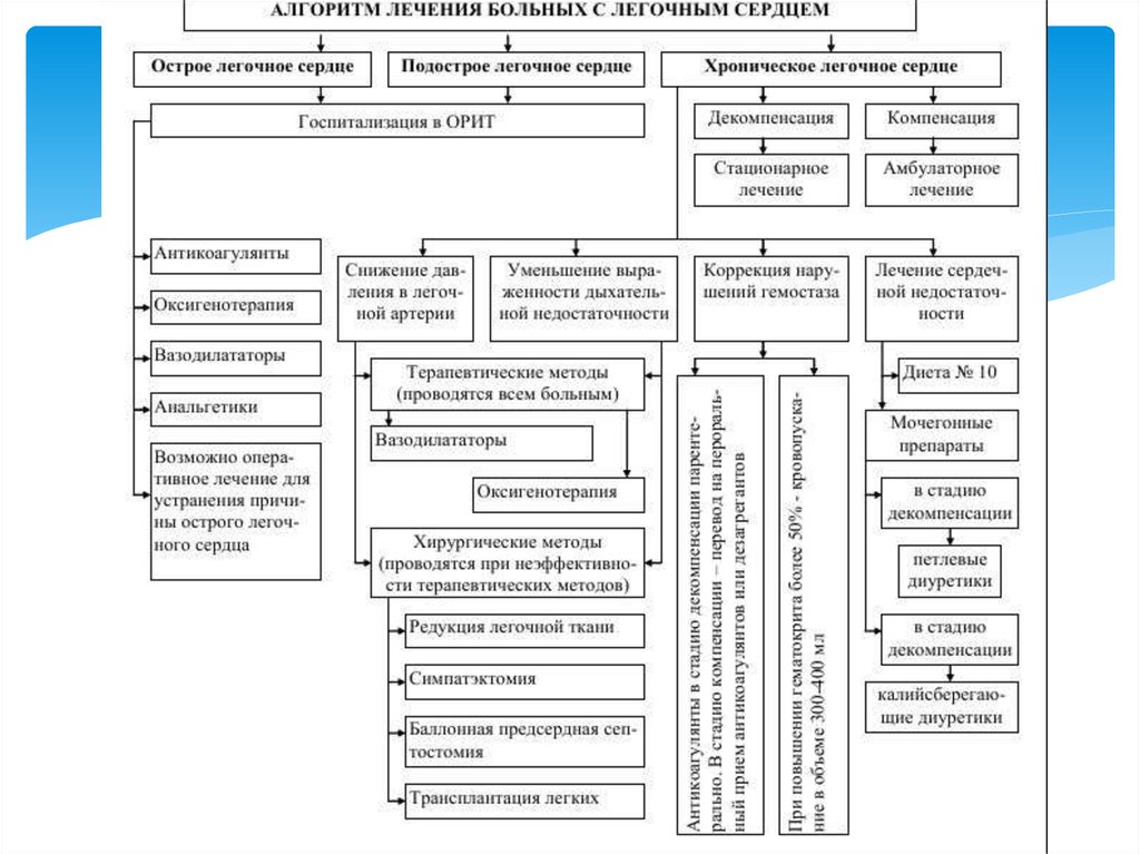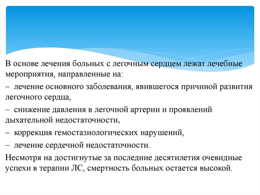 В основе лечения больных с легочным сердцем лежат лечебныемероприятия, направленные на: