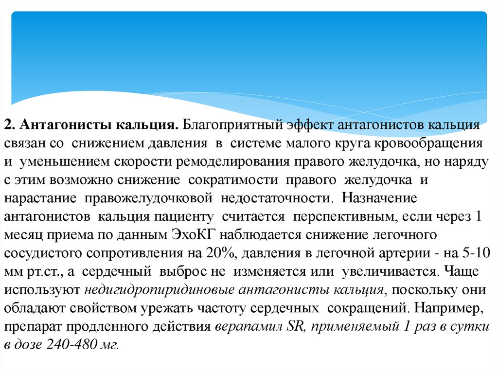 2. Антагонисты кальция. Благоприятный эффект антагонистов кальциясвязан со снижением давления в системе малого круга кровообращения