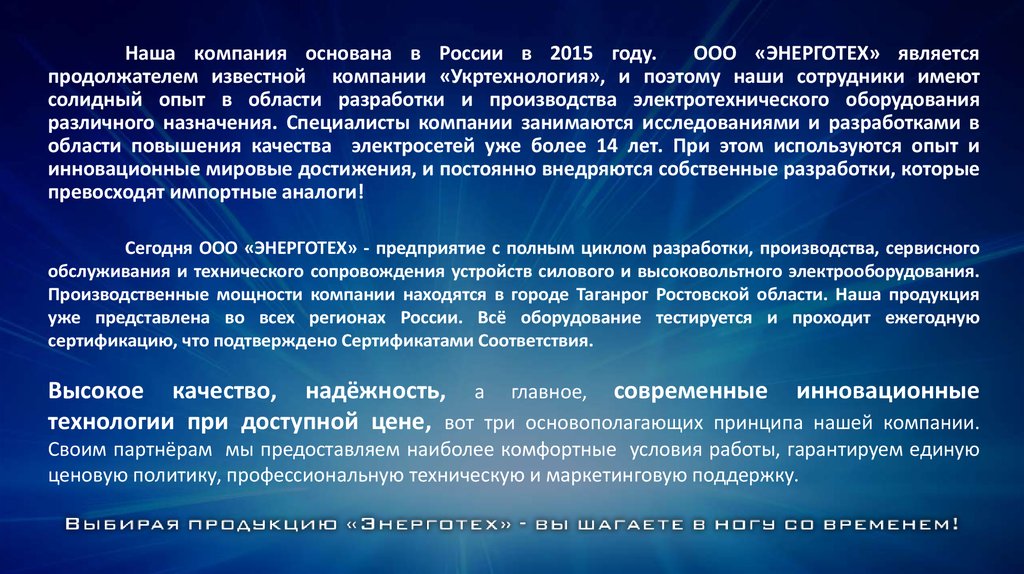 Наша компания основана в России в 2015 году.ООО «ЭНЕРГОТЕХ» является