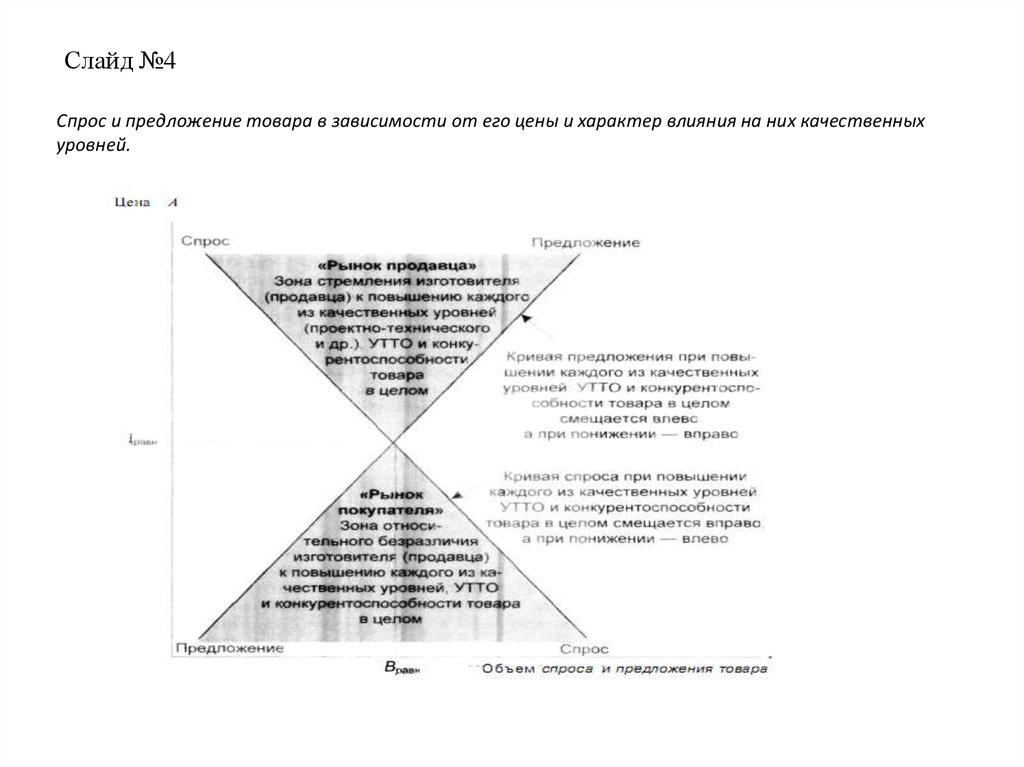 Слайд №4Спрос и предложение товара в зависимости от его цены и характер влияния на них качественных