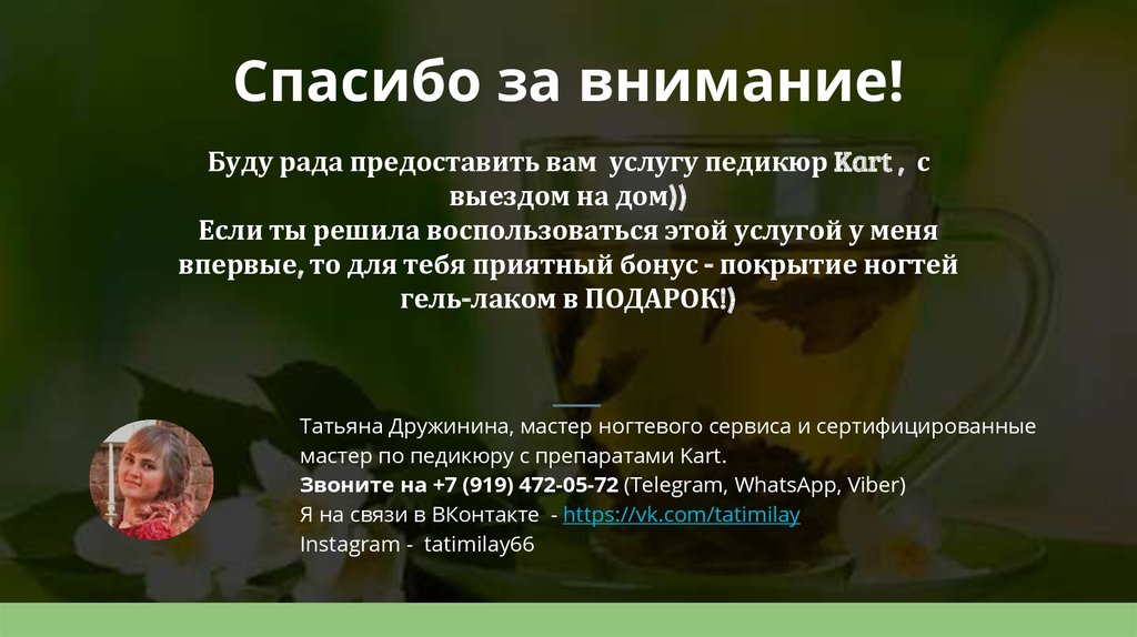 Спасибо за внимание!Буду рада предоставить вам услугу педикюр Kart , с