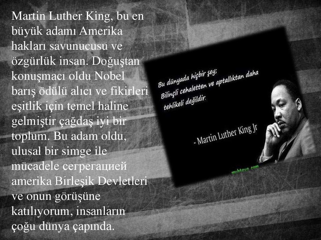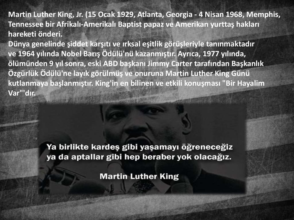 Martin Luther King, Jr. (15 Ocak 1929, Atlanta, Georgia - 4 Nisan 1968, Memphis,Tennessee bir Afrikalı-Amerikalı Baptist papaz ve Amerikan yurttaş hakları