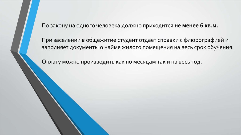 По закону на одного человека должно приходится не менее 6 кв.м.При заселении в общежитие студент отдает справки с флюрографией и