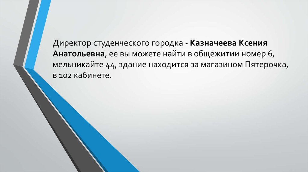 Директор студенческого городка - Казначеева КсенияАнатольевна, ее вы можете найти в общежитии номер 6,