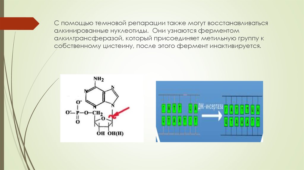 С помощью темновой репарации также могут восстанавливатьсяалкинированные нуклеотиды. Они узнаются ферментом