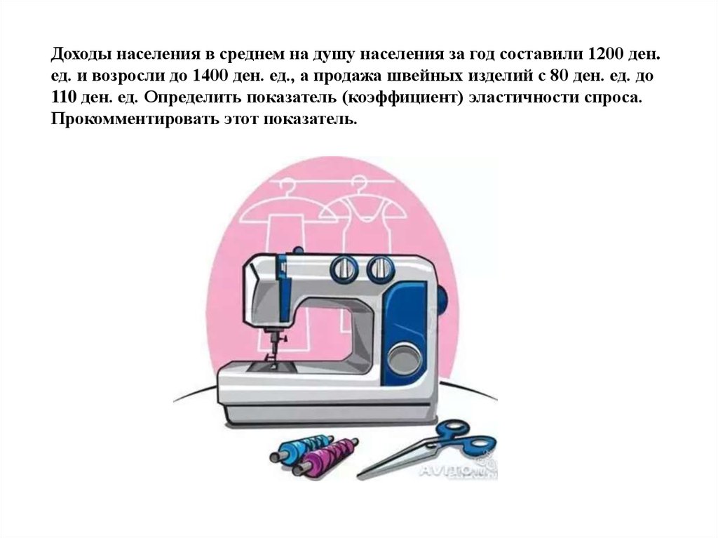 Доходы населения в среднем на душу населения за год составили 1200 ден.ед. и возросли до 1400 ден. ед., а продажа швейных изделий с 80 ден. ед. до