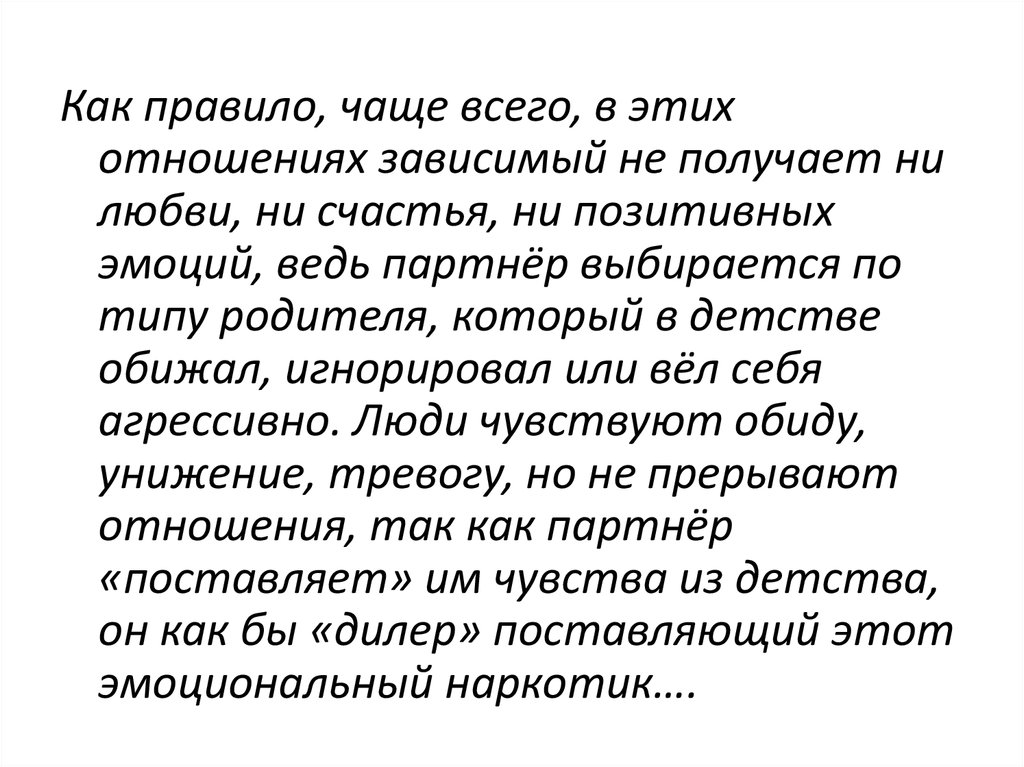 Как правило, чаще всего, в этихотношениях зависимый не получает ни