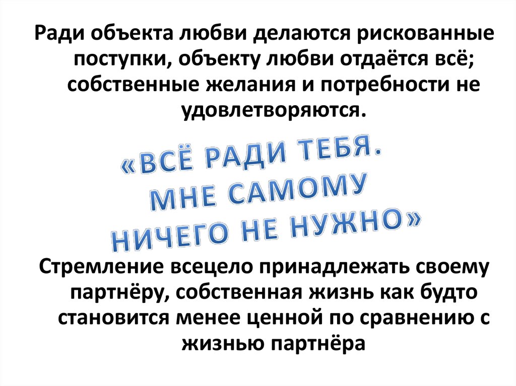 Ради объекта любви делаются рискованныепоступки, объекту любви отдаётся всё;