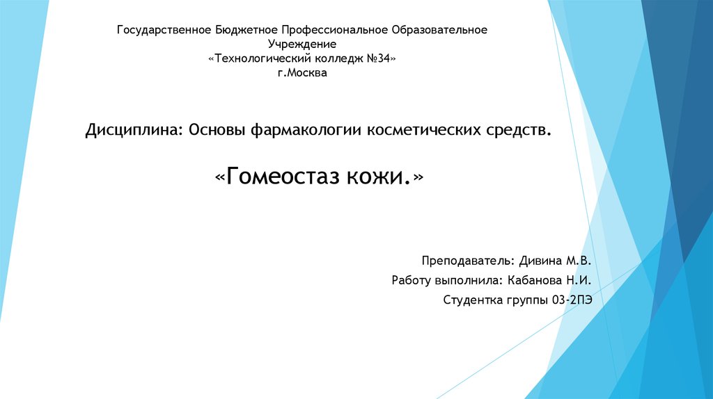 Дисциплина: Основы фармакологии косметических средств.«Гомеостаз кожи.»