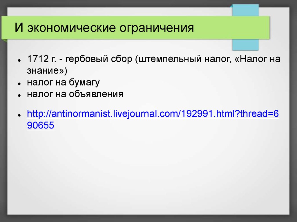 И экономические ограничения1712 г. - гербовый сбор (штемпельный налог, «Налог на