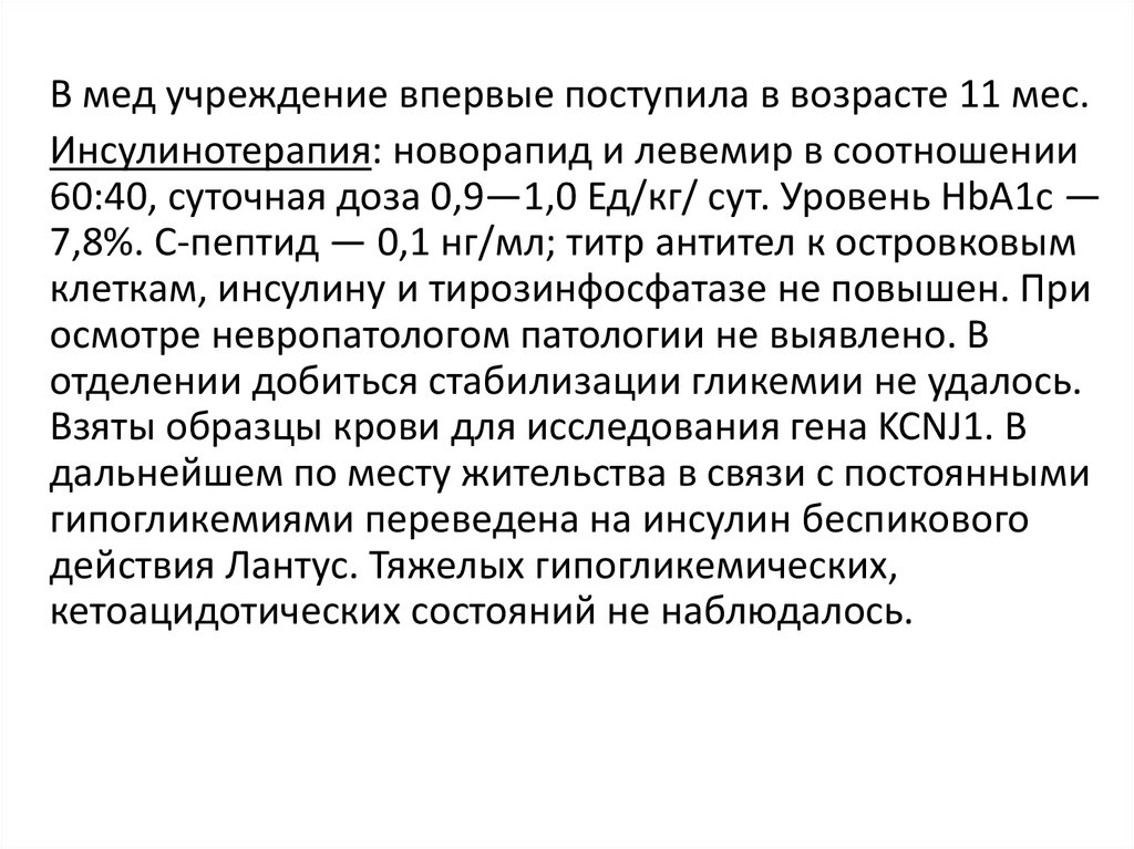 В мед учреждение впервые поступила в возрасте 11 мес.Инсулинотерапия: новорапид и левемир в соотношении