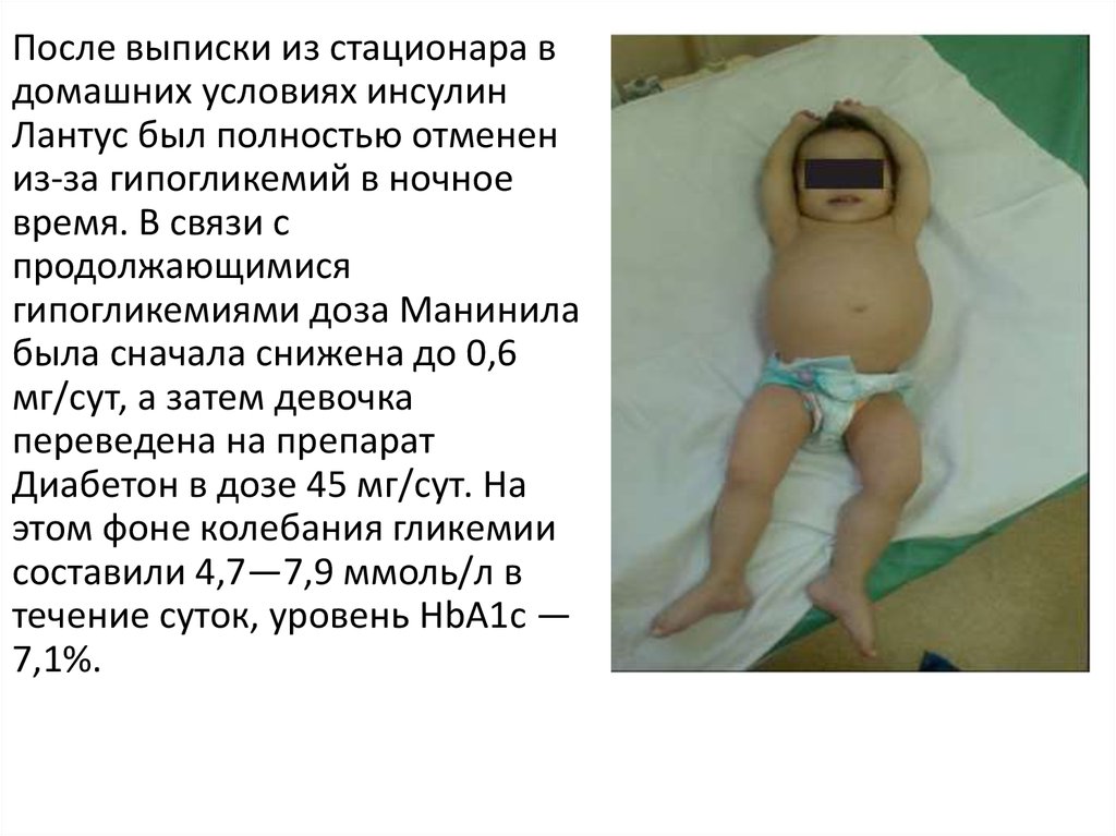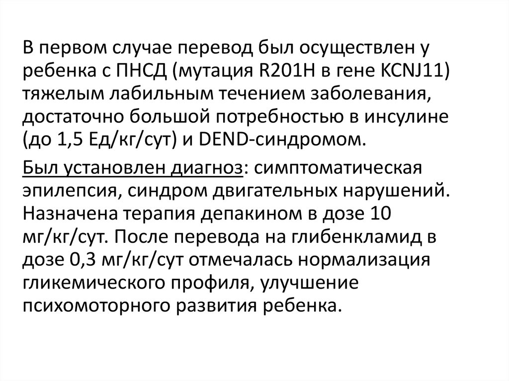 В первом случае перевод был осуществлен уребенка с ПНСД (мутация R201H в гене KCNJ11)