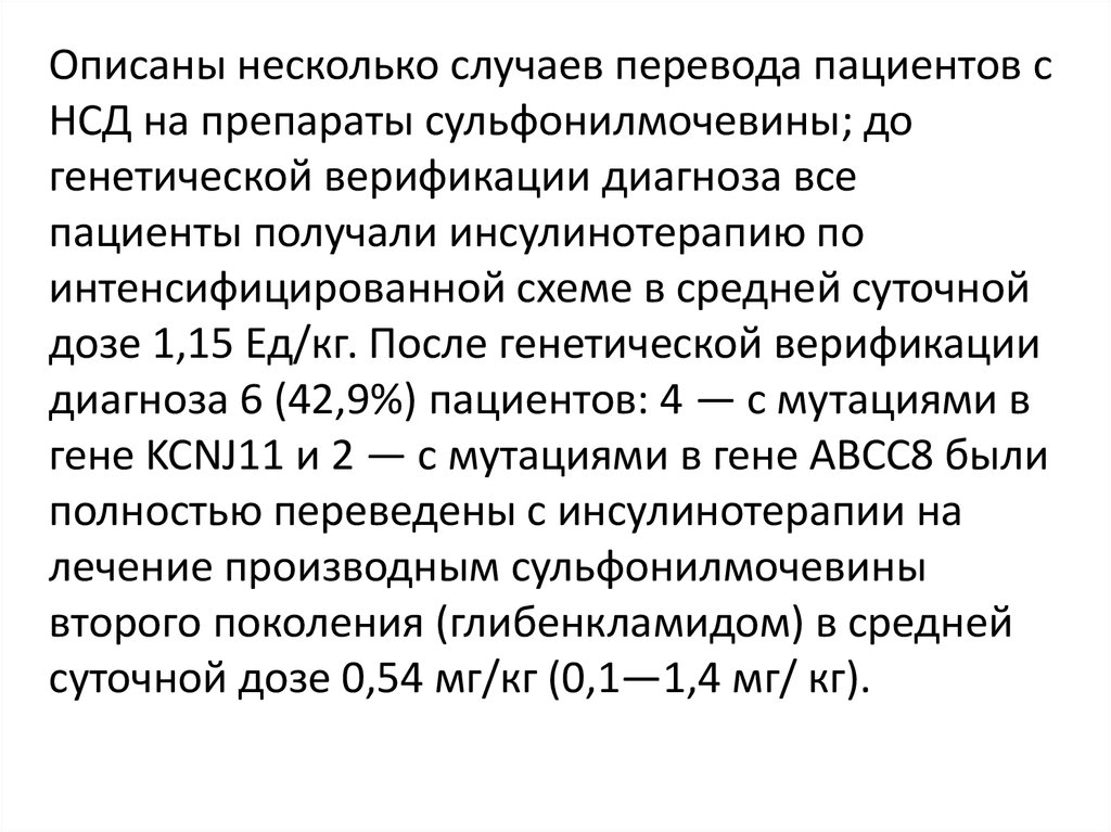 Описаны несколько случаев перевода пациентов сНСД на препараты сульфонилмочевины; до