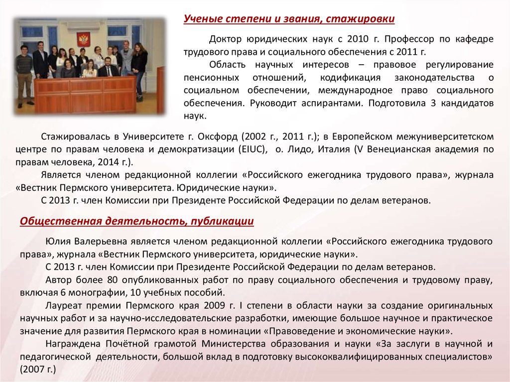 Ученые степени и звания, стажировкиДоктор юридических наук с 2010 г. Профессор по кафедре