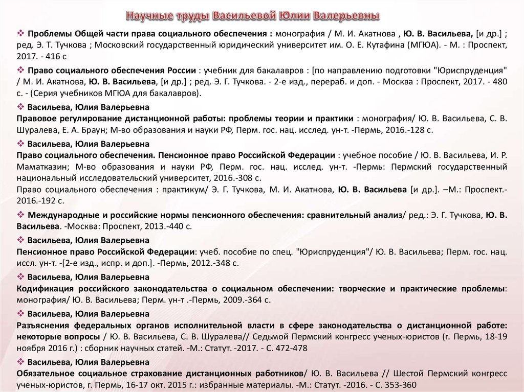 Автор более 80 опубликованных работ по праву социального обеспечения и трудовому праву,