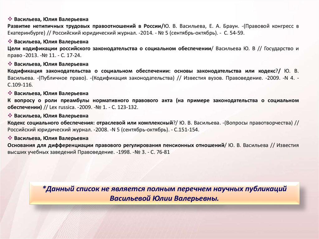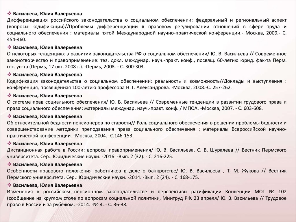 Васильева, Юлия ВалерьевнаДефекты отсылок в законодательстве о социальном обеспечении/ Ю. В. Васильева // Пермский конгресс ученыхюристов: тез. докл. междунар. науч.-практ. конф., 22 окт. 2010 г. -Пермь, 2010. - C. 404-408.