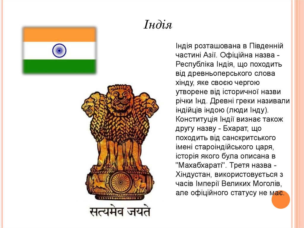 частині Азії. Офіційна назва Республіка Індія, що походить