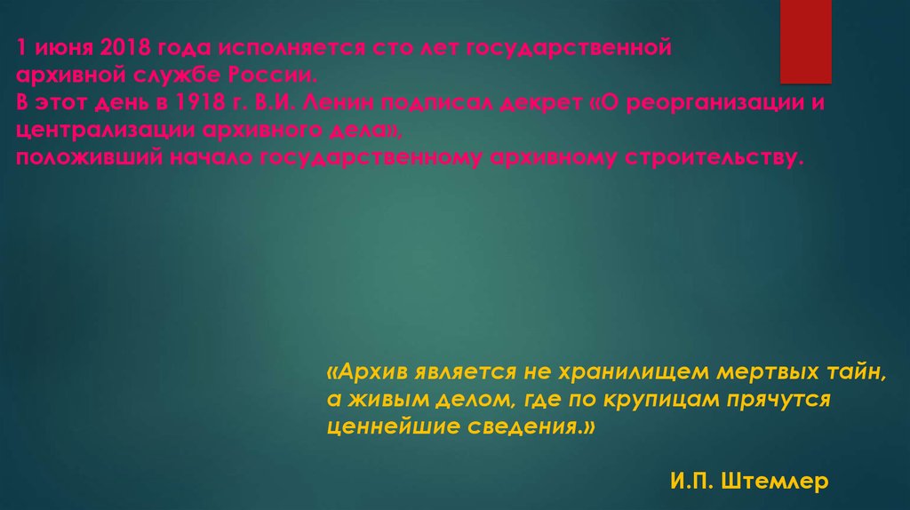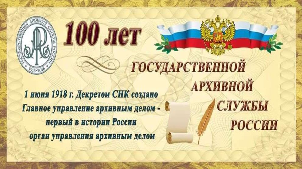 1 июня 2018 года исполняется сто лет государственнойархивной службе России.