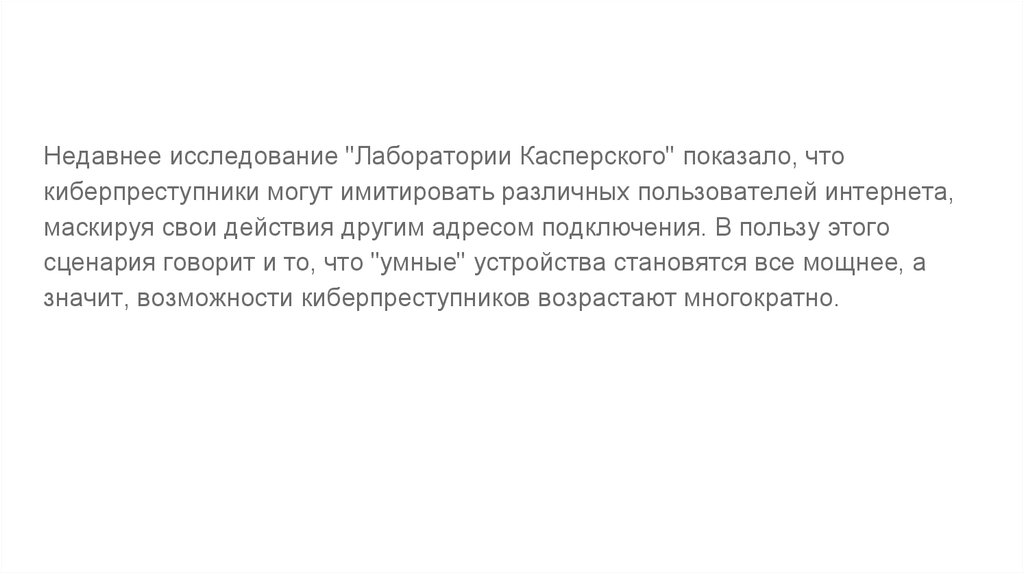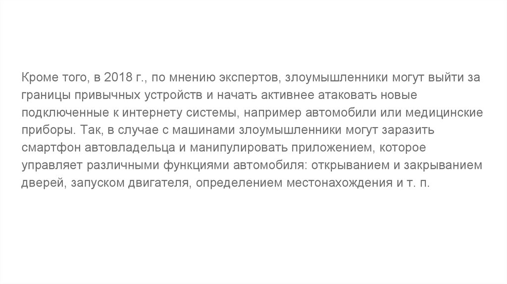 Кроме того, в 2018 г., по мнению экспертов, злоумышленники могут выйти заграницы привычных устройств и начать активнее атаковать новые