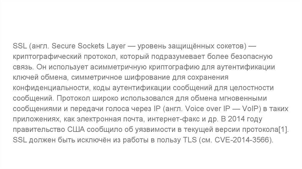 SSL (англ. Secure Sockets Layer — уровень защищённых cокетов) —криптографический протокол, который подразумевает более безопасную