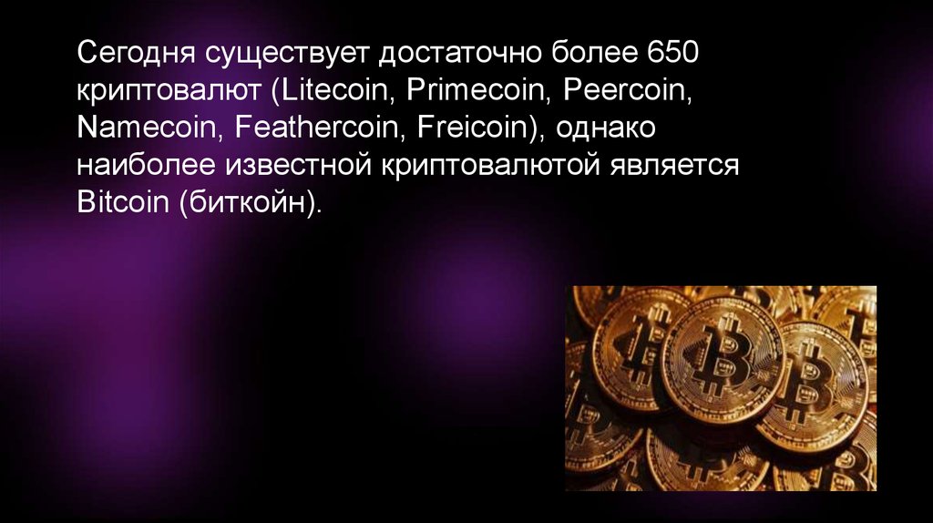 Сегодня существует достаточно более 650криптовалют (Litecoin, Primecoin, Peercoin,