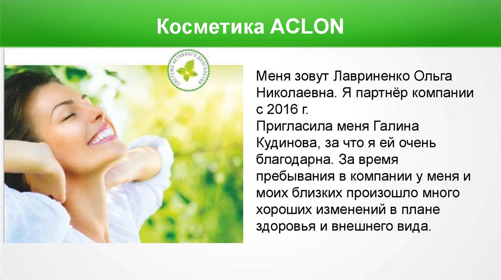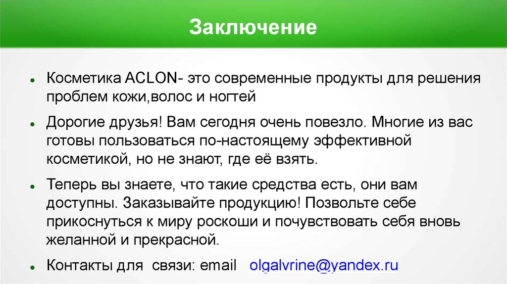 ЗаключениеКосметика ACLON- это современные продукты для решения