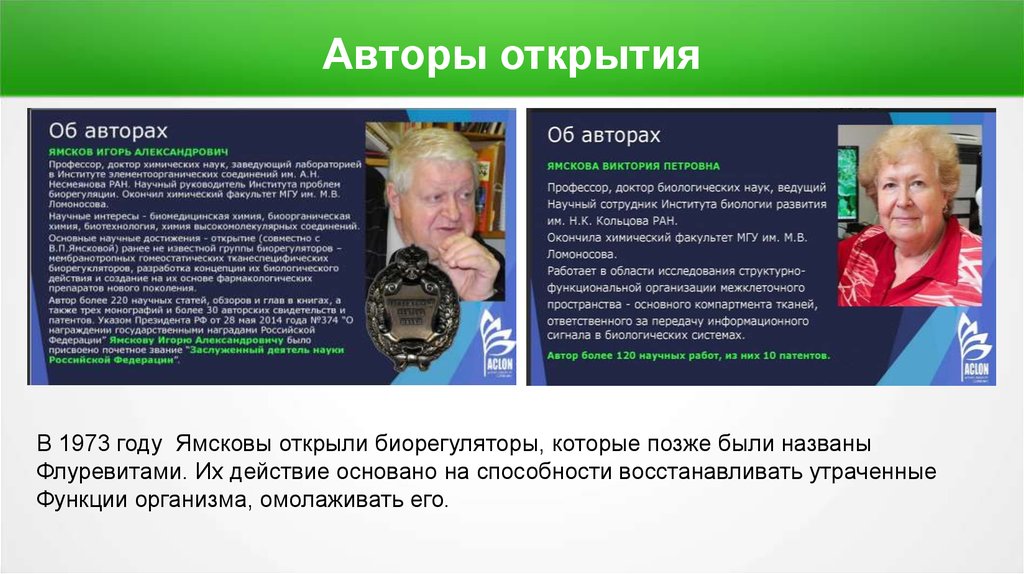 Авторы открытияВ 1973 году Ямсковы открыли биорегуляторы, которые позже были названы
