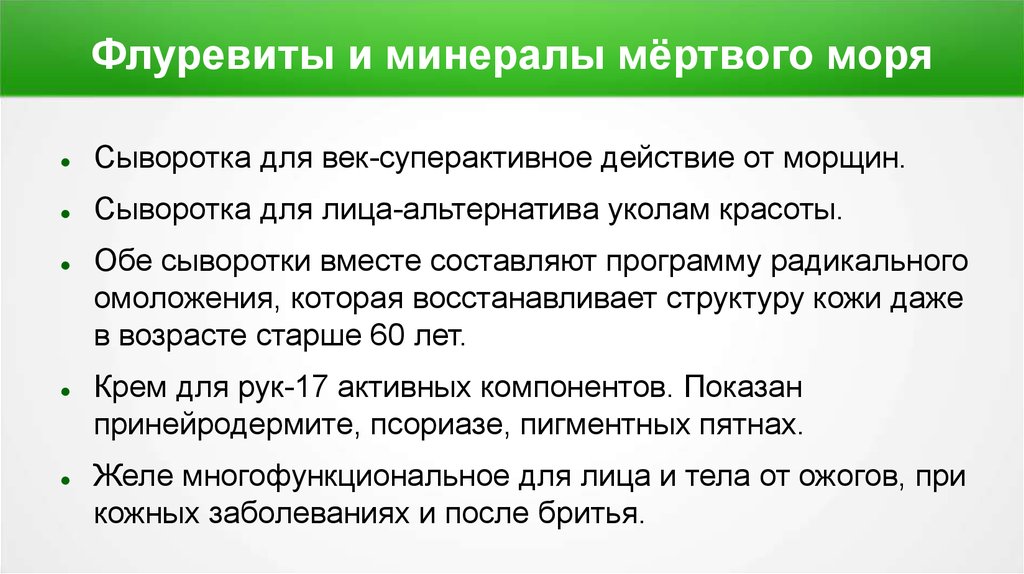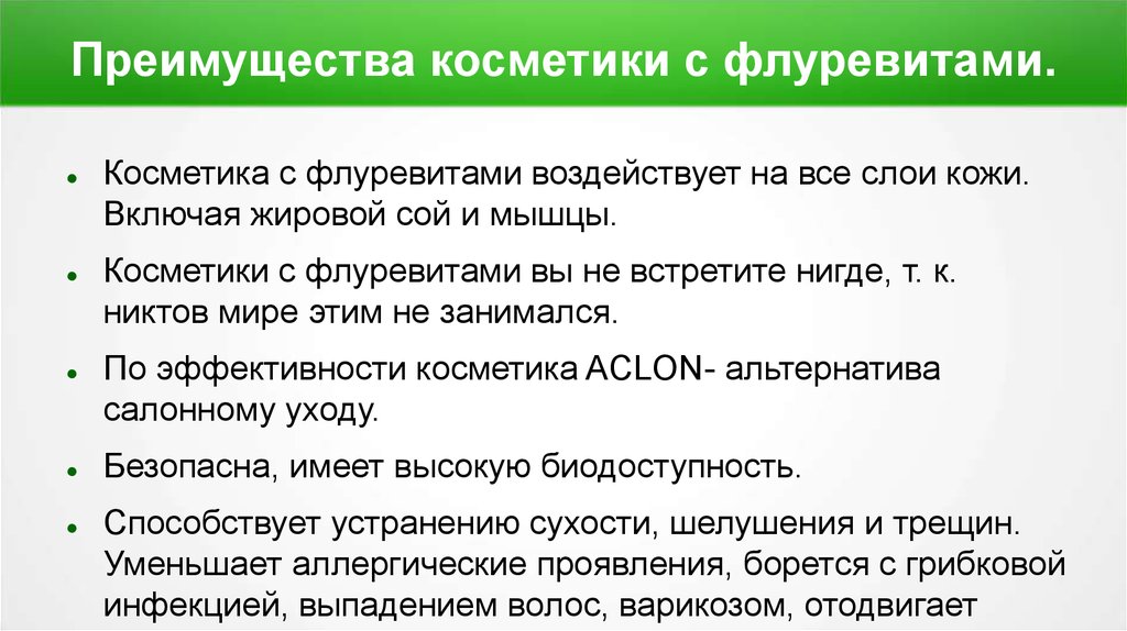 Преимущества косметики с флуревитами.Косметика с флуревитами воздействует на все слои кожи.