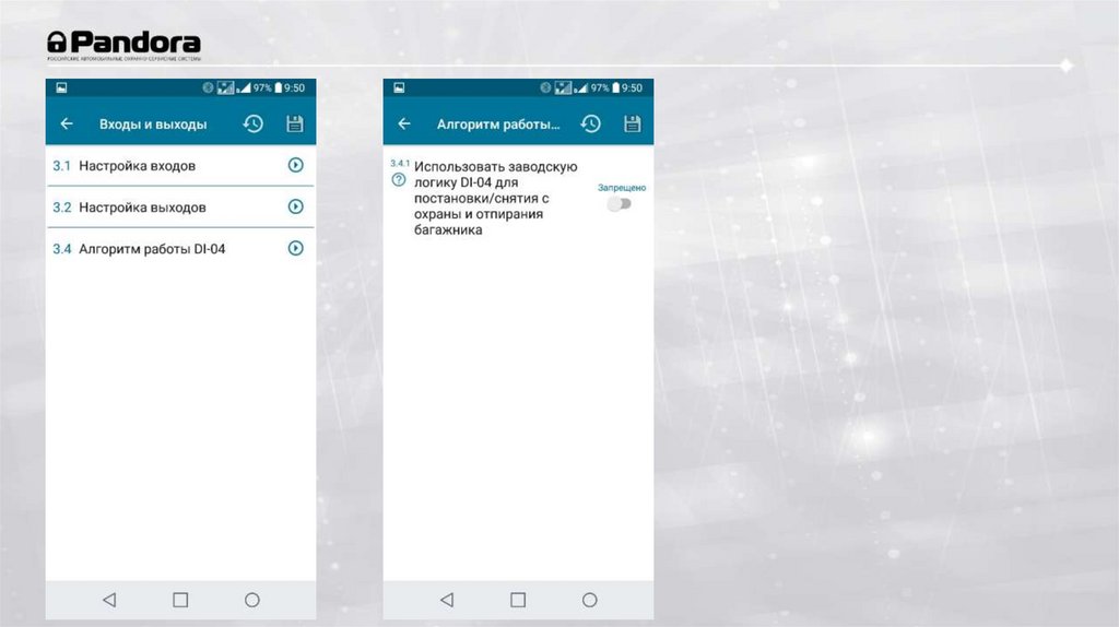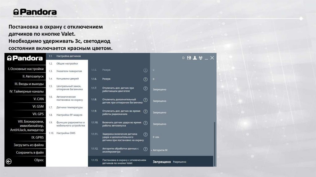 Постановка в охрану с отключениемдатчиков по кнопке Valet.