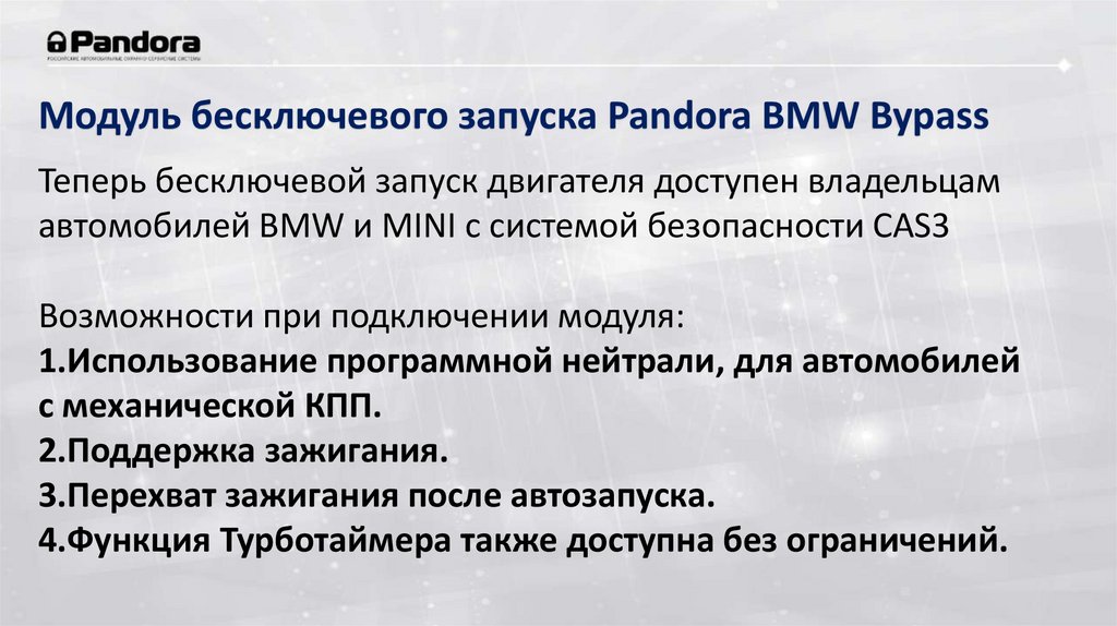 Модуль бесключевого запуска Pandora BMW BypassТеперь бесключевой запуск двигателя доступен владельцам