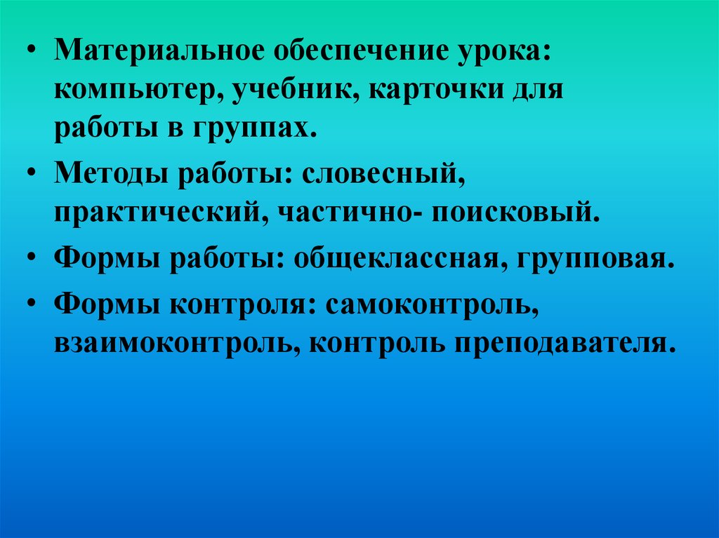 • Материальное обеспечение урока:компьютер, учебник, карточки для