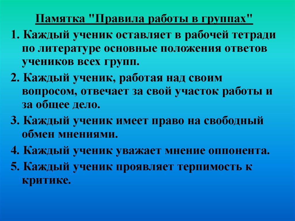 Памятка "Правила работы в группах"1. Каждый ученик оставляет в рабочей тетради