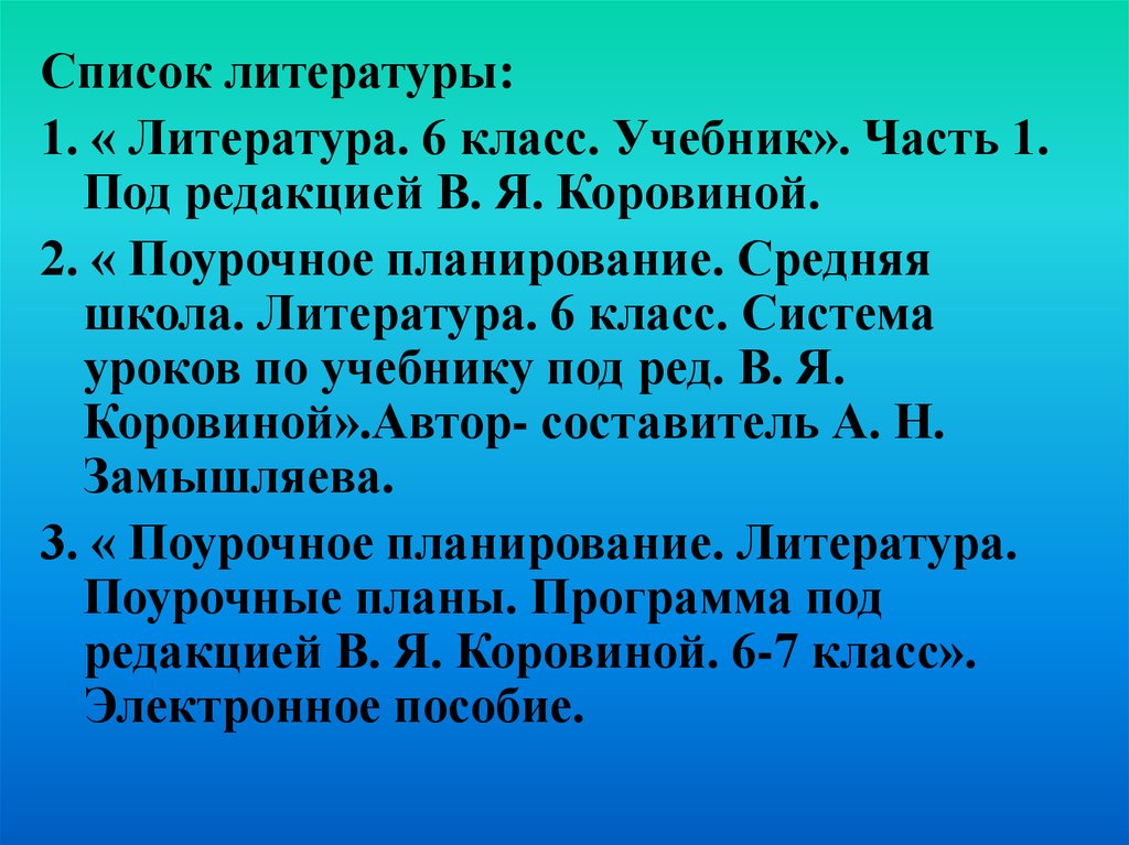 Список литературы:1. « Литература. 6 класс. Учебник». Часть 1.