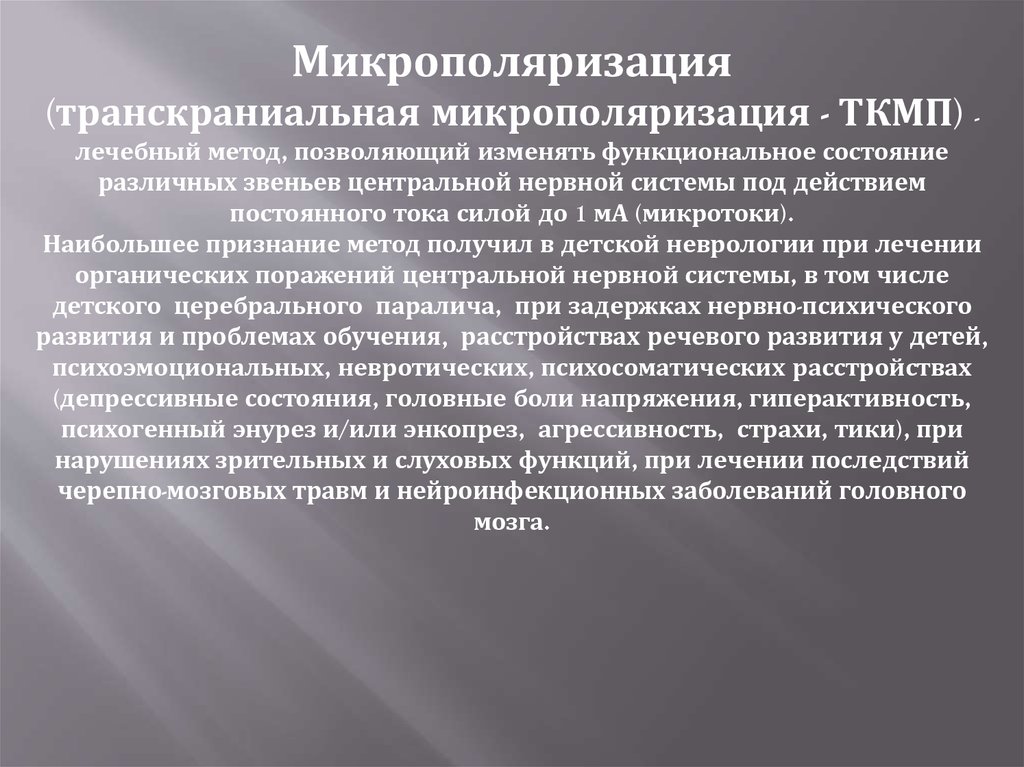 Микрополяризация(транскраниальная микрополяризация - ТКМП) лечебный метод, позволяющий изменять функциональное состояние