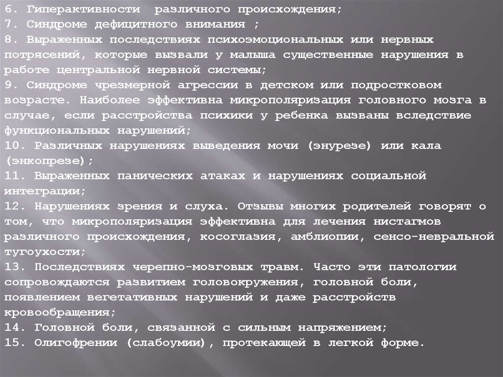 6. Гиперактивности различного происхождения;7. Синдроме дефицитного внимания ;