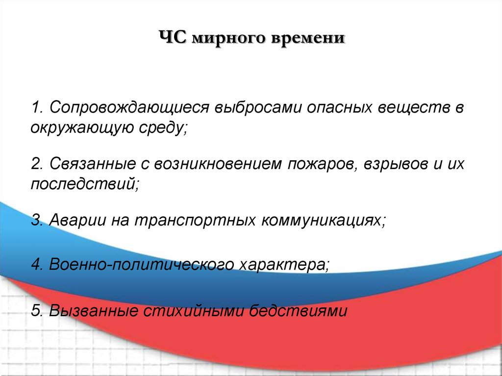 ЧС мирного времени1. Сопровождающиеся выбросами опасных веществ в