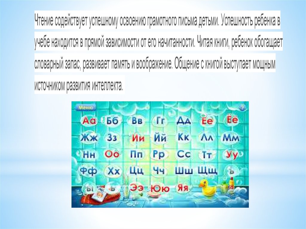 Чтение содействует успешному освоению грамотного письма детьми. Успешность ребенка вучебе находится в прямой зависимости от его начитанности. Читая книги, ребенок обогащает