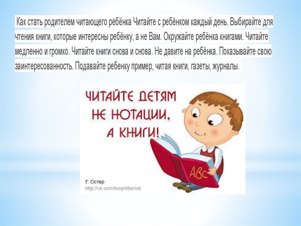 Как стать родителем читающего ребёнка Читайте с ребёнком каждый день. Выбирайте длячтения книги, которые интересны ребёнку, а не Вам. Окружайте ребёнка книгами. Читайте