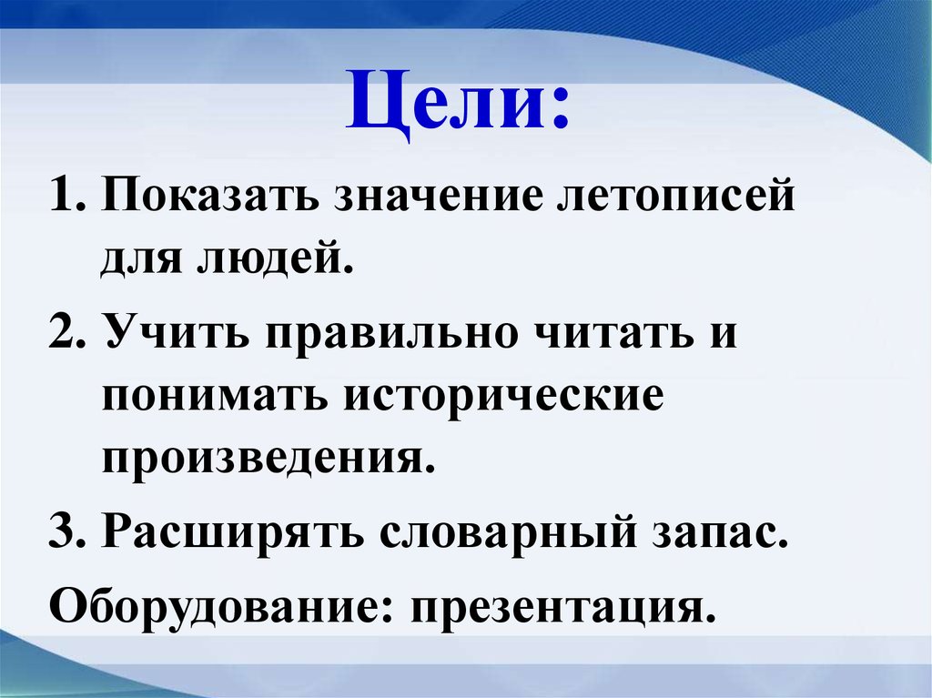 Цели:1. Показать значение летописей