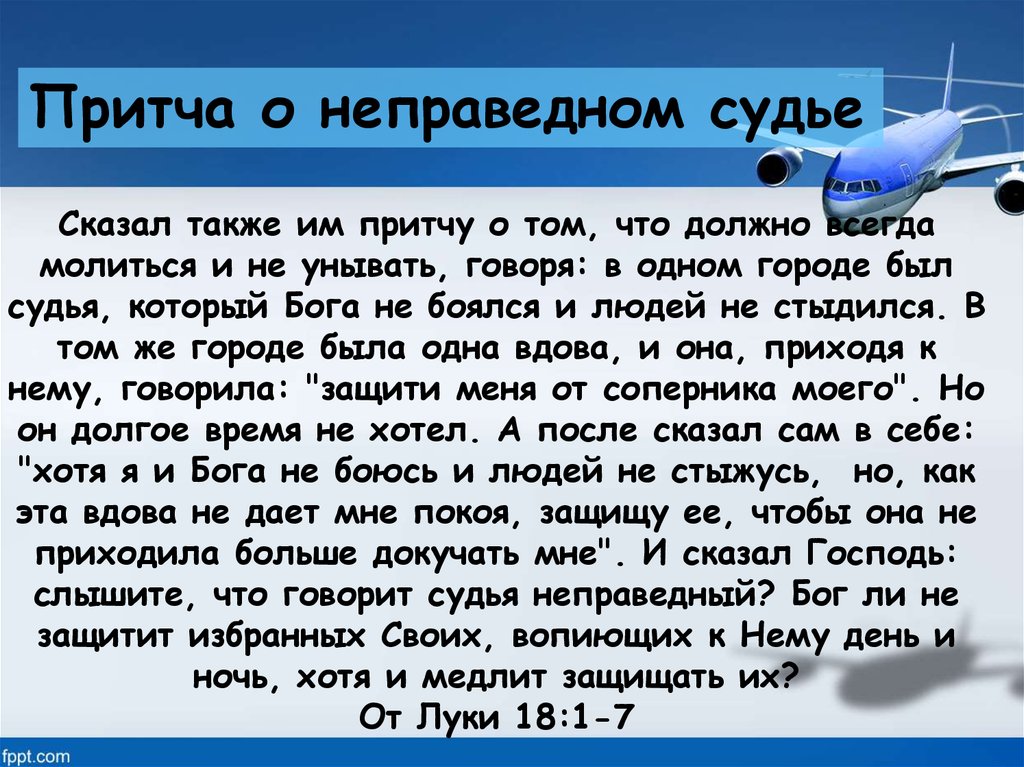 Притча о неправедном судьеСказал также им притчу о том, что должно всегда