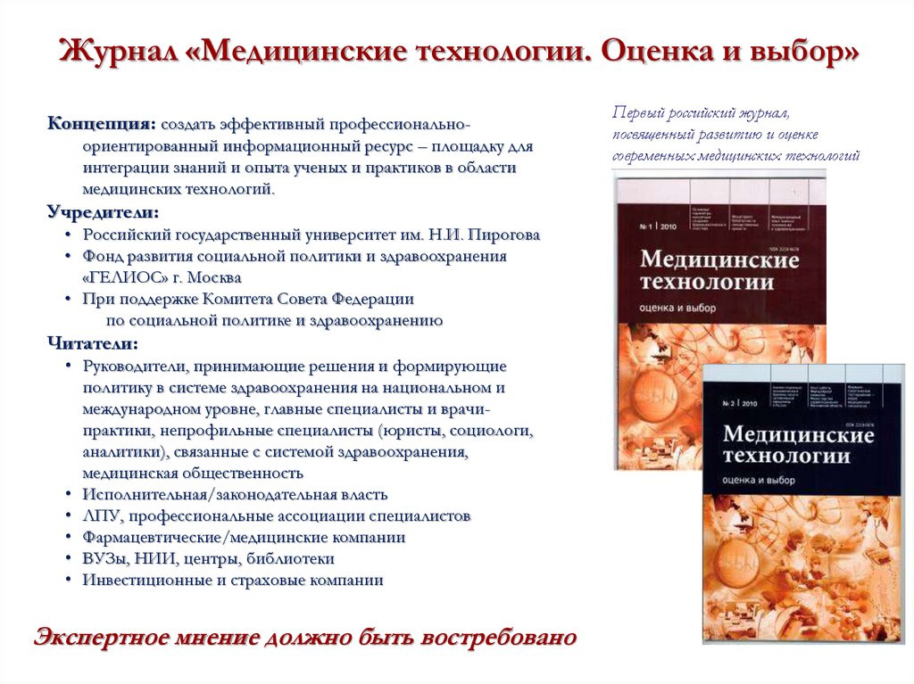 Журнал «Медицинские технологии. Оценка и выбор»Концепция: создать эффективный профессиональноориентированный информационный ресурс – площадку для