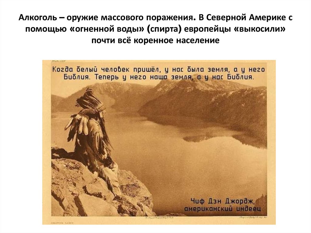 Алкоголь – оружие массового поражения. В Северной Америке спомощью «огненной воды» (спирта) европейцы «выкосили»