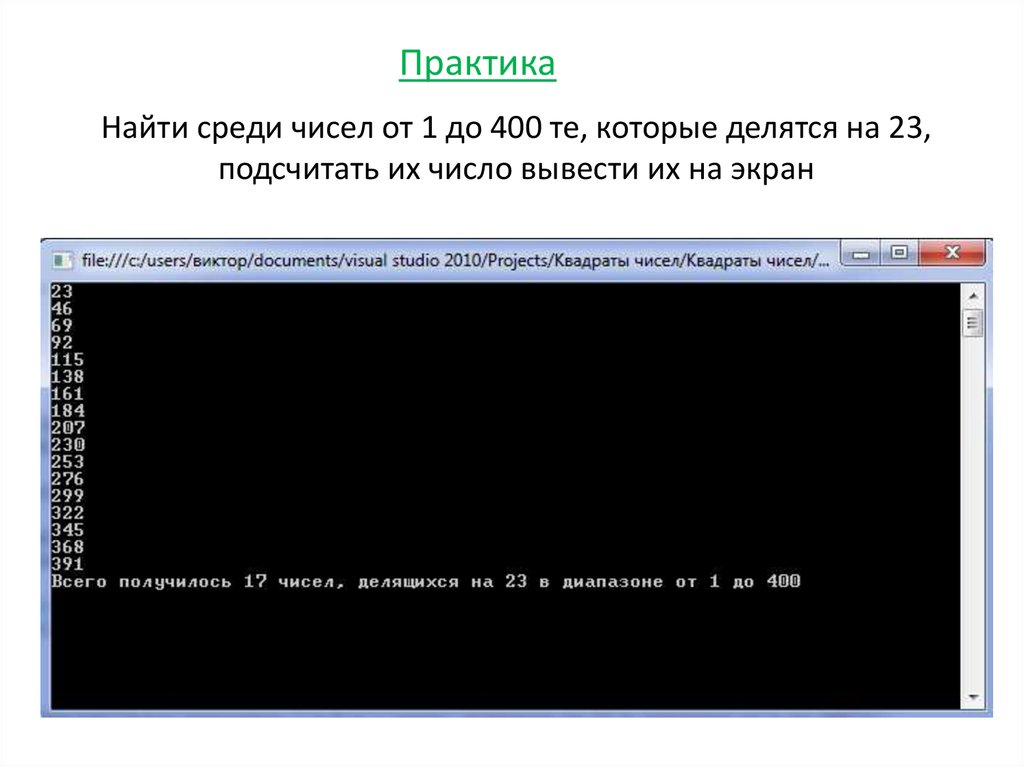 ПрактикаНайти среди чисел от 1 до 400 те, которые делятся на 23,