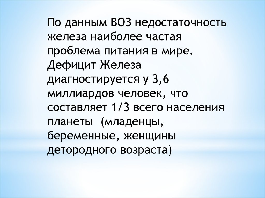 По данным ВОЗ недостаточностьжелеза наиболее частая