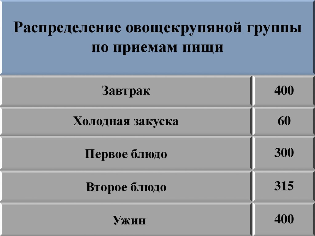 Распределение овощекрупяной группыпо приемам пищи