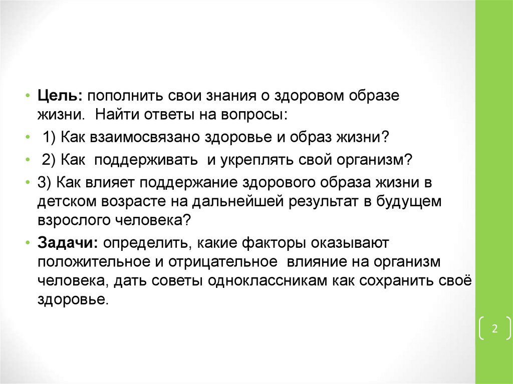 • Цель: пополнить свои знания о здоровом образежизни. Найти ответы на вопросы: